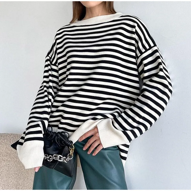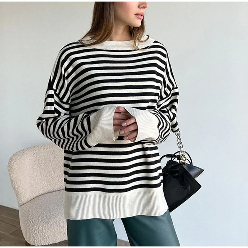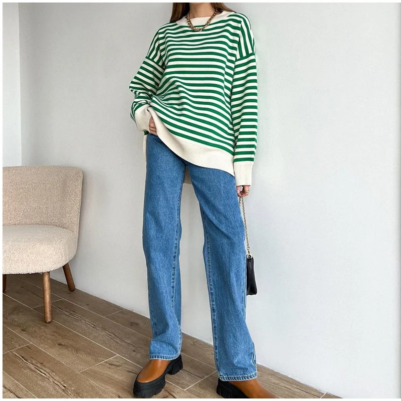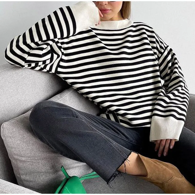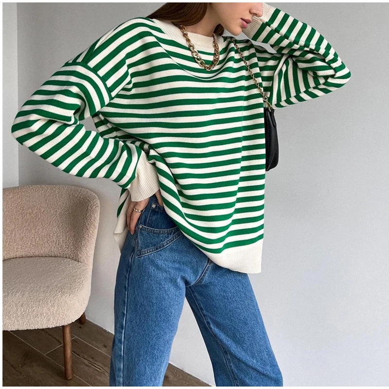 Women's O Neck Striped Sweater Pullovers Drop Shoulder Kintting Tops Casual Loose Long Sleeves Jumpers Autumn Winter For Female