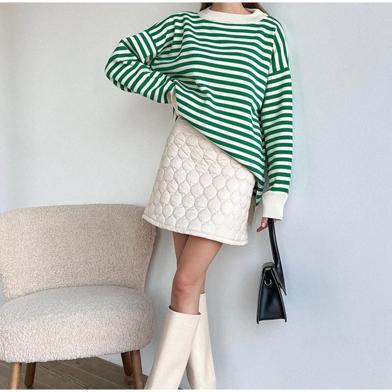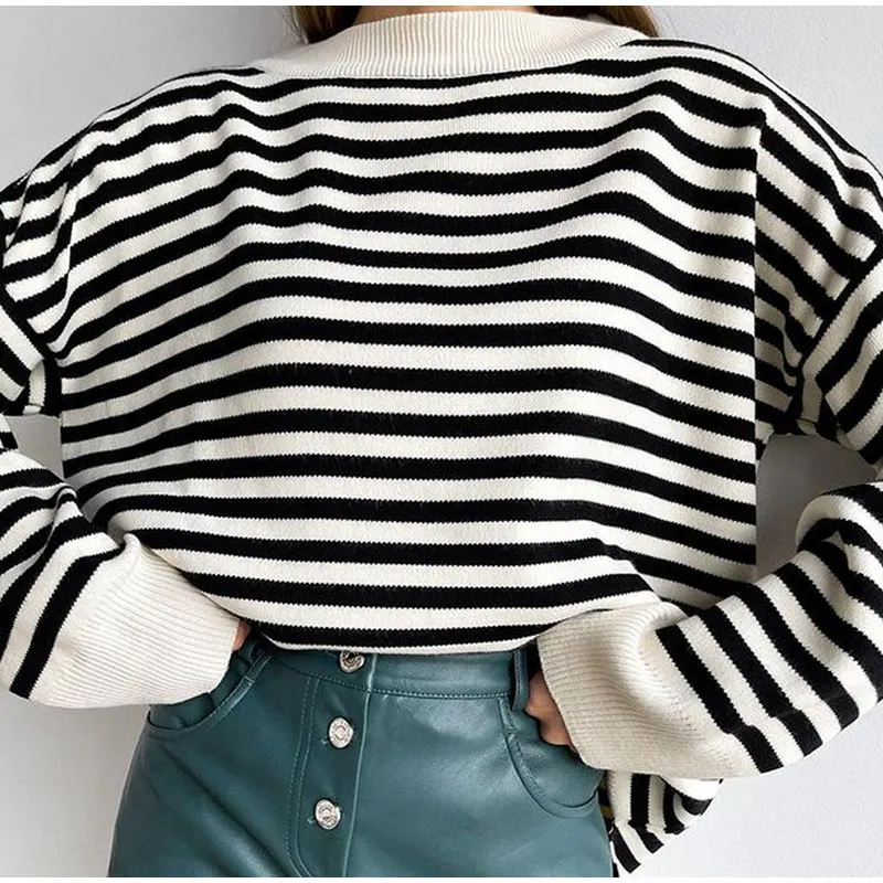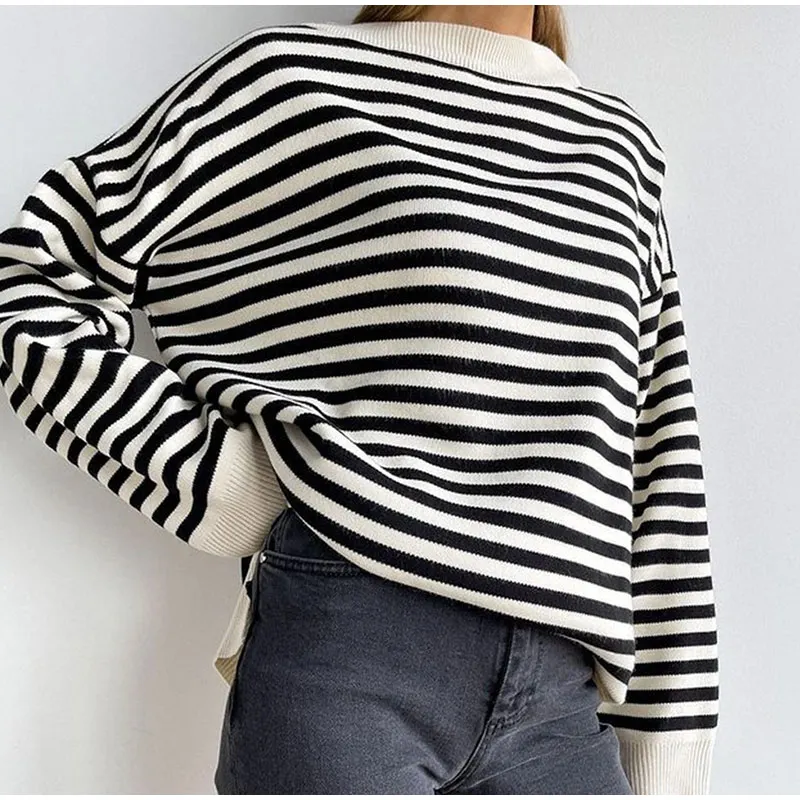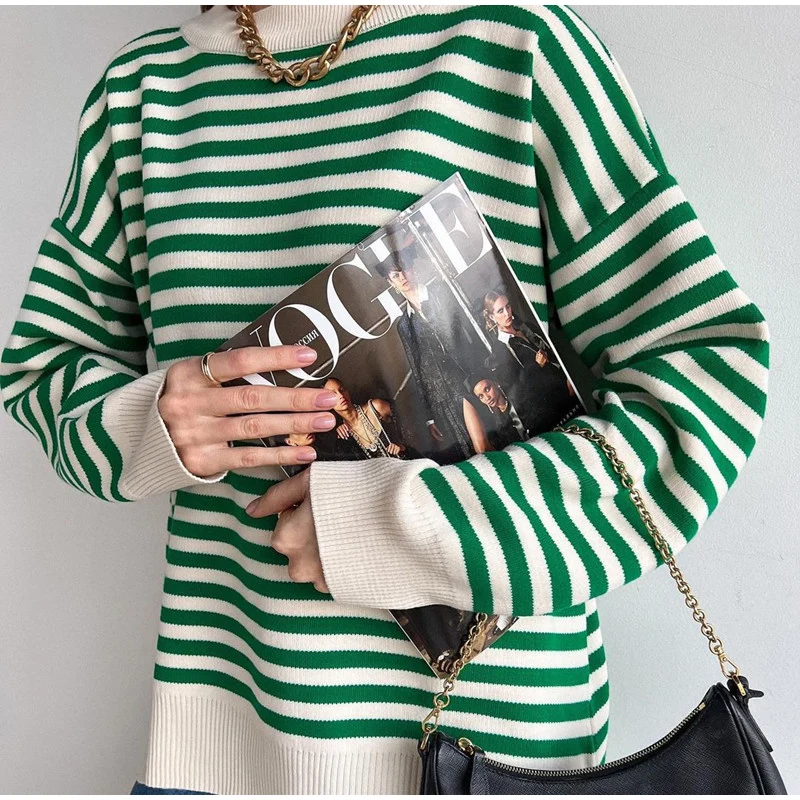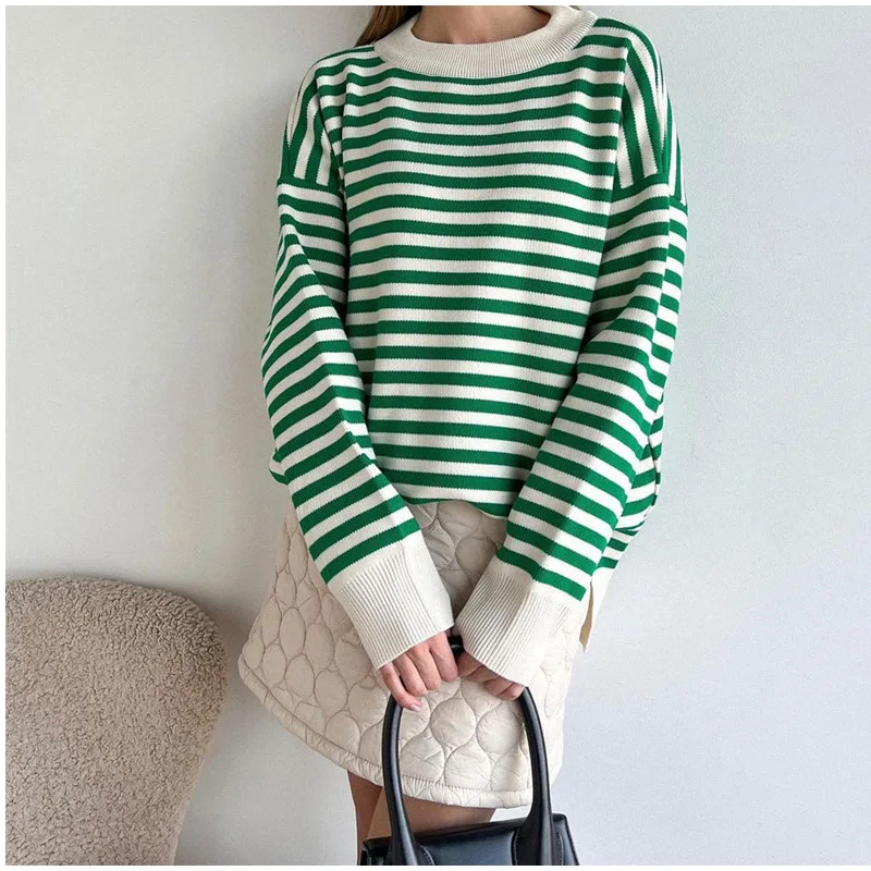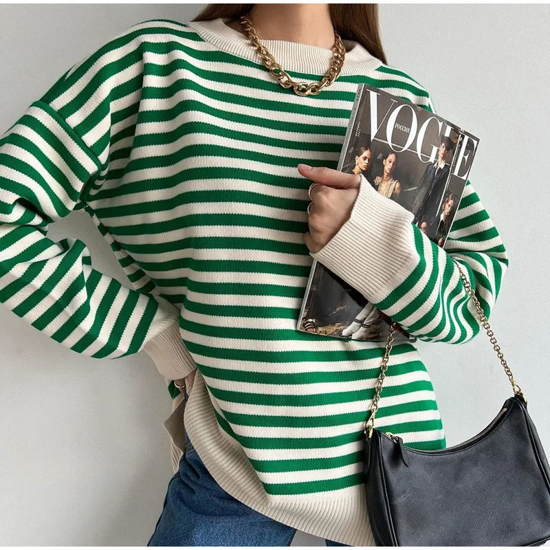 Women's O Neck Striped Sweater Pullovers Drop Shoulder Kintting Tops Casual Loose Long Sleeves Jumpers Autumn Winter For Female